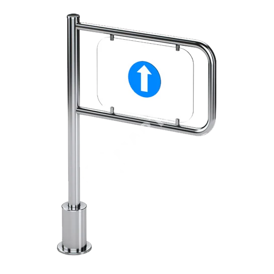 Створка калитки крепится к стойке при помощи установочных винтов. Стойка вращается относительно неподвижного основания, прикрепленного к полу. Крепление к полу скрывает крышка основания. В калитке предусмотрена возможность установки створок различной длины для формирования прохода шириной 1200 мм. Калитка закрывается после прохода при помощи пружины, направление движения обозначается стрелкой.