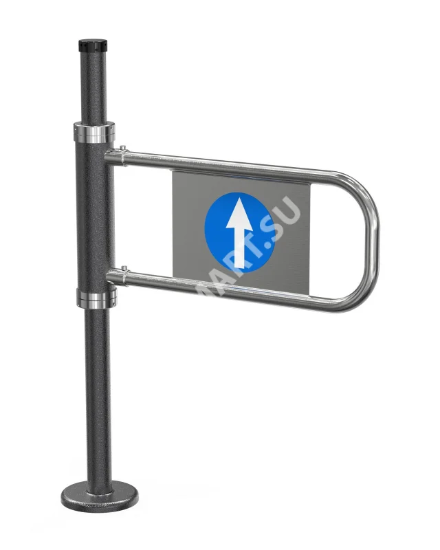 Калитка является односторонней (левой): дуга проворачивается только в одну сторону — на 90° против часовой стрелки. После прохода дуга автоматически возвращается в исходное положение под действием возвратной пружины и гидравлического доводчика, надежно перекрывая проход. Это идеальное решение для организации направленного движения в узких проходах.