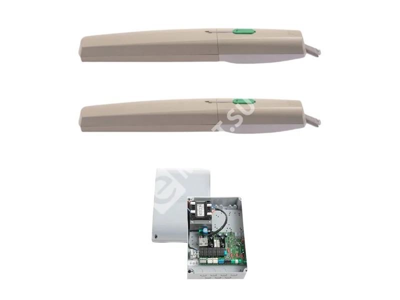 Комплект для распашных ворот до 300 кг или до 3,5 м; интенсивность 50%, класс защиты IP44; диапазон рабочих температур от -20°С до +55°С; напряжение питания 230В; электропитание двигателя 24В; тип привода линейный, электромеханический.