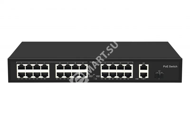 Неадминистрируемый коммутатор, 24 RJ-45 POE порта (10/100 Мбит/с), 2 RJ-45 Uplink порта (1000 Мбит/с), 1 SFP Uplink порт (1000 Мбит/с), бюджет на порт до 30 Вт, общий бюджет до 300 Вт.