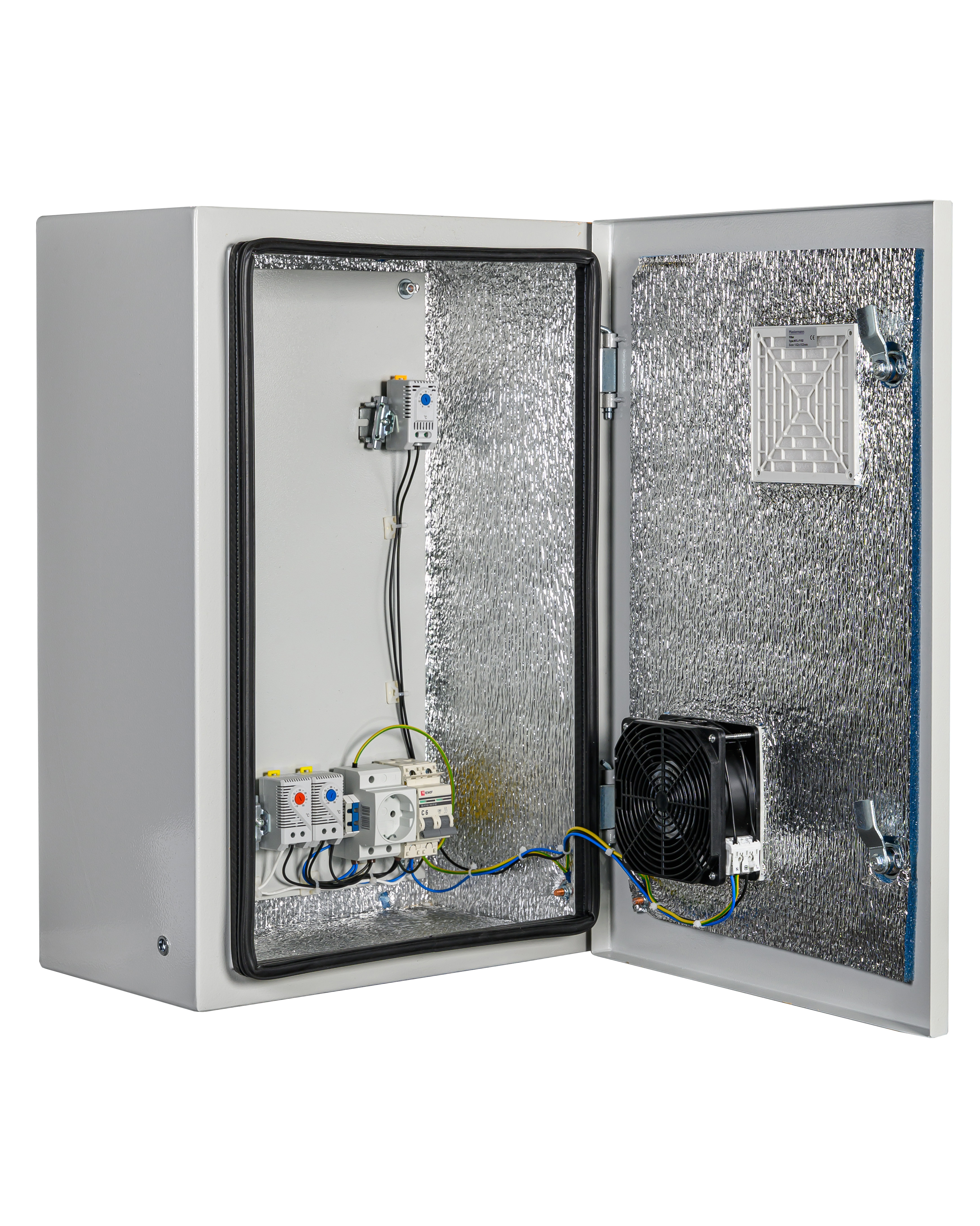 утеплитель из порилекса, замок 2 шт, ключ 1 шт, монтажная плата 1шт, гермовводы 2 шт (MG-25), розетка 1 шт, автоматический выключатель, 6А 1шт, клемма для подключения оборудования 2 шт, клемма заземления 1 шт, термореле 1шт, реле предстарта 1 шт, вентиляционная решётка с фильтром 1 шт, вентилятор с решёткой и фильтром 1 шт, нагреватель мощностью 100 Вт 1шт.