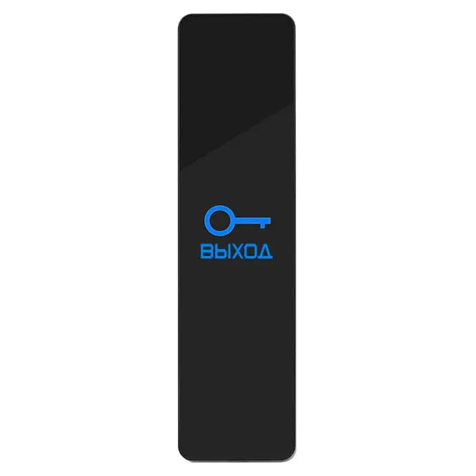 Кнопка выхода накладная  сенсорная, пластиковая черного цвета, ультра тонкий корпус. Подсветка. Коммутируемый ток - 3А. Питание 12-24В DC. Контакты: НО и НЗ. Температура эксплуатации:  -20..+55С. Габаритные размеры: 150х40х12 мм.
