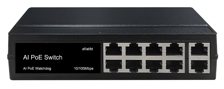 PoE коммутатор 8x100 Мбит/с PoE порта (6 портов 802.3af/at, максимальная мощность PoE 30Вт на порт, 2 порта 802.3af/at/bt, максимальная мощность PoE 60Вт на порт) + 2x100 Мбит/с порта Uplink, общий бюджет PoE 120 Вт, автоматический PoE watchdog, автоматический выбор длины линии и скорости работы (1 и 2 порт, до 130м скорость 100Мбит/с, от 130м до 250м скорость 10Мбит/с), встроенный блок питания, грозозащита и защита от статического электричества, от -30°С до +60°С.