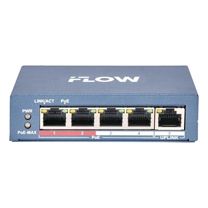 4 RJ45 100M PoE с грозозащитой 6кВ, 2 порта с высоким приоритетом; 1 Uplink порт 100М Ethernet; бюджет PoE 60Вт; поддержка режима передачи до 300м,10Мб/с, CAT6; таблица MAC адресов на 1000 записей; пропускная способность 1Гб/с; стандарты PoE: IEEE802.3af, IEEE802.3at; 48 VDC, 1.35 A;  0 °C...+40°C.