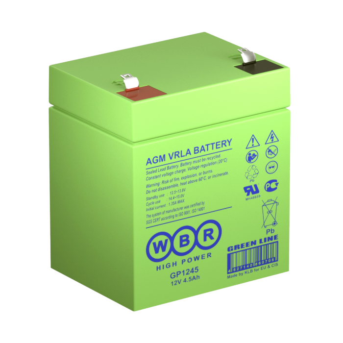 Аккумулятор WBR GP1245 - герметизированная, выполненная по технологии AGM, аккумуляторная батарея общего применения со сроком службы до 8 лет в буферном режиме или 260 циклов заряда-разряда в циклическом режиме при 100% разряде. Эта высокоэффективная, перезаряжаемая батарея, не требующая обслуживания в течение всего срока службы.