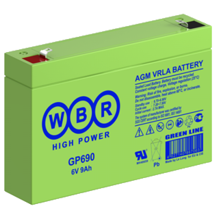Аккумулятор WBR GP690 - герметизированная, выполненная по технологии AGM, аккумуляторная батарея общего применения со сроком службы до 8 лет в буферном режиме или 260 циклов заряда-разряда в циклическом режиме при 100% разряде. Высокоэффективная перезаряжаемая батарея, не требующая обслуживания в течение всего срока службы.