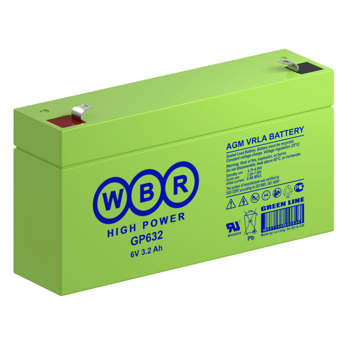 Аккумулятор WBR GP632 - герметизированная, выполненная по технологии AGM, аккумуляторная батарея общего применения со сроком службы до 8 лет в буферном режиме или 260 циклов заряда-разряда в циклическом режиме при 100% разряде. Высокоэффективная перезаряжаемая батарея, не требующая обслуживания в течение всего срока службы.