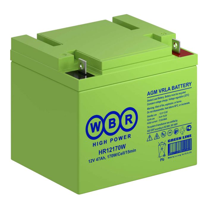 Аккумулятор WBR HR12170W - герметизированная, выполненная по технологии AGM, аккумуляторная батарея общего применения со сроком службы до 8 лет в буферном режиме или 260 циклов заряда-разряда в циклическом режиме при 100% разряде. Эта высокоэффективная, перезаряжаемая, батареи не требующая обслуживания в течение всего срока службы.