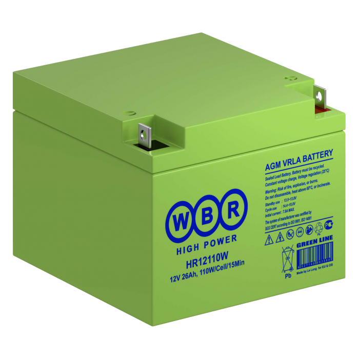 Аккумулятор WBR HR12110W - герметизированная, выполненная по технологии AGM, аккумуляторная батарея общего применения со сроком службы до 8 лет в буферном режиме или 260 циклов заряда-разряда в циклическом режиме при 100% разряде. Эта высокоэффективная, перезаряжаемая, батареи не требующая обслуживания в течение всего срока службы.