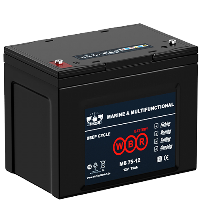 Аккумулятор WBR MB75-12 - лодочный свинцово-кислотный, герметизированный, выполнен по технологии AGM. Обладает высоким качеством и надежностью, устойчива к глубоким разрядам. Применяется для питания на яхтах, катерах и моторных лодках, а также возможны к применению как источники питания для электронасосов, эхолотов, осветительных приборов, ИБП и другого вспомогательного оборудования