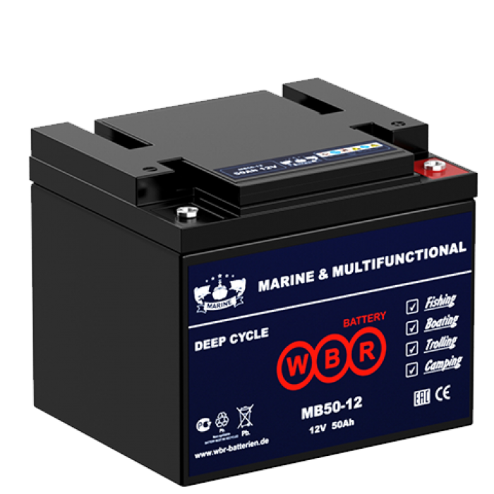Аккумулятор WBR MB50-12 - лодочный, свинцово-кислотный, герметизированный, выполнен по технологии AGM. Обладает высоким качеством и надежностью, устойчива к глубоким разрядам. Применяется для питания на яхтах, катерах и моторных лодках, а так же возможны к применению как источники питания для электронасосов, эхолотов, осветительных приборов и другого вспомогательного оборудования.