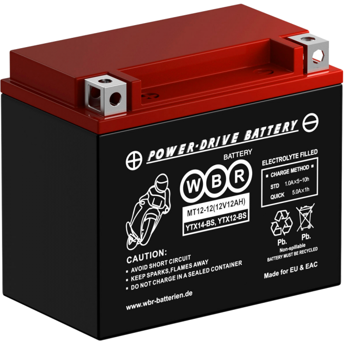 Аккумулятор WBR МТ12-12 - герметизированная, выполненная по технологии AGM, необслуживаемая (MF) стартерная мотоциклетная свинцово-кислотная аккумуляторная батарея. Обладает высоким качеством и надежностью. Она предназначена для запуска двигателя мотоциклов, скутеров, гидроциклов, квадроциклов, снегоходов и мотовездеходов. Батарея соответствует техническим характеристикам и является аналогом мотоциклетных аккумуляторных батарей YUASA моделей YTX14-BS и YTX12-BS.