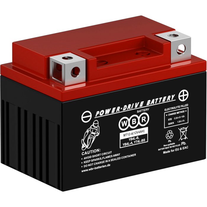 Аккумулятор WBR МТ12-4 - герметизированная, выполненная по технологии AGM, необслуживаемая (MF) стартерная мотоциклетная свинцово-кислотная аккумуляторная батарея. Обладает высоким качеством и надежностью. Она предназначена для запуска двигателя мотоциклов, скутеров, гидроциклов, квадроциклов, снегоходов и мотовездеходов. Батарея соответствует техническим характеристикам и является аналогом мотоциклетных аккумуляторных батарей YUASA моделей YB4L-B и YT4L-BS.
