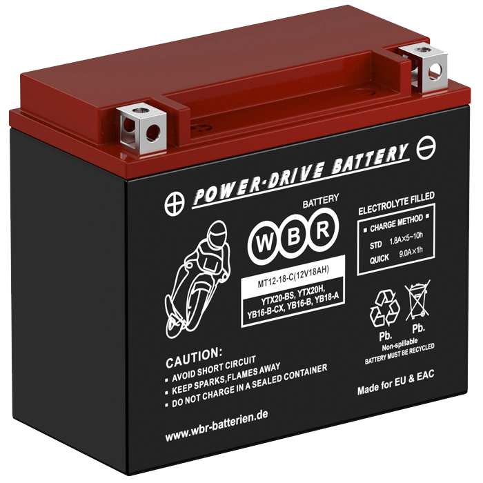 Герметизированные, выполненные по технологии AGM, необслуживаемые (MF) стартерные мотоциклетные свинцово-кислотные аккумуляторные батареи WBR серии МТ12-18-C обладают высоким качеством и надежностью. Они предназначены для запуска двигателя мотоциклов, скутеров, гидроциклов, квадроциклов, снегоходов и мотовездеходов. Батареи соответствуют техническим характеристикам и являются аналогом мотоциклетных аккумуляторных батарей YUASA модели YTX20-BS, YTX20H, YB16-B-CX, YB16-B, YB18-A .