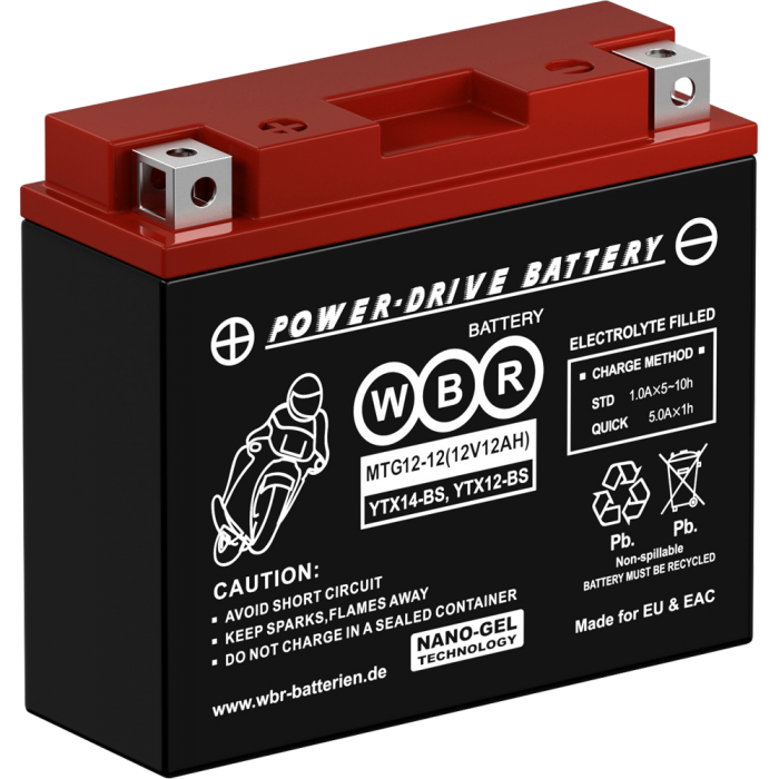 Герметизированные, выполненные по гелевой технологии (GEL), стартерные мотоциклетные свинцово-кислотные аккумуляторы WBR MTG12-12 обладают высоким качеством и надежностью. Эти аккумуляторные батареи успешно выдерживают конкуренцию со стартерными батареями этого класса других производителей, соответствуют техническим характеристикам и являются аналогом мотоциклетных аккумуляторных батарей YUASA серии YB14L-BS. Они предназначены для работы приборов и пусковых механизмов на мотоциклах, скутерах, гидроциклах, квадроциклах, снегоходах и мотовездеходах.