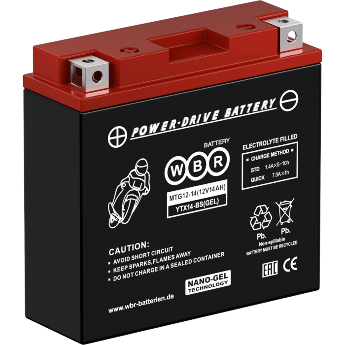 Герметизированные, выполненные по гелевой технологии (GEL), стартерные мотоциклетные свинцово-кислотные аккумуляторы WBR MTG12-14 обладают высоким качеством и надежностью. Эти аккумуляторные батареи успешно выдерживают конкуренцию со стартерными батареями этого класса других производителей, соответствуют техническим характеристикам и являются аналогом мотоциклетных аккумуляторных батарей YUASA серии YB14L-BS. Они предназначены для работы приборов и пусковых механизмов на мотоциклах, скутерах, гидроциклах, квадроциклах, снегоходах и мотовездеходах.