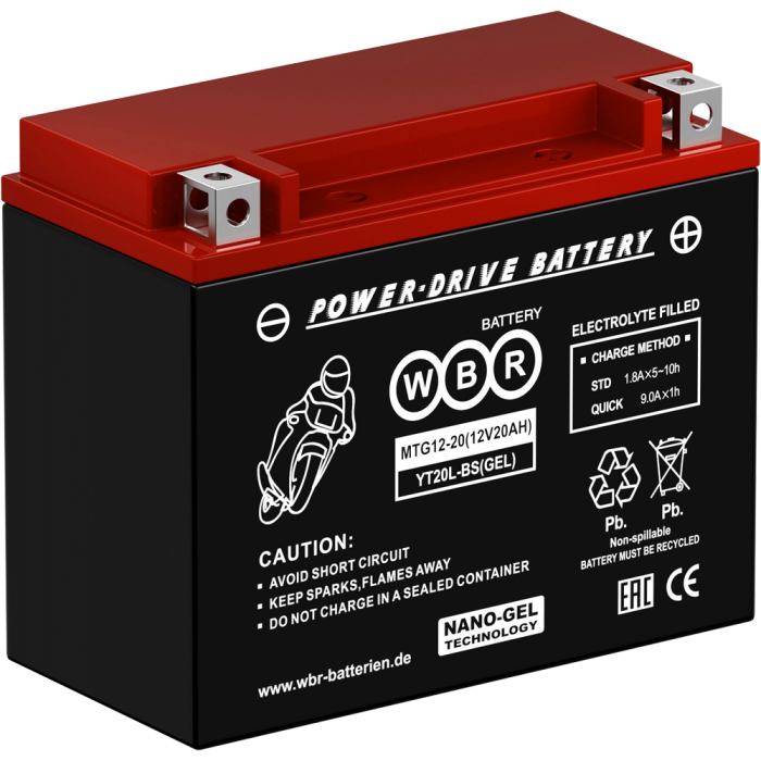 Герметизированные, выполненные по гелевой технологии (GEL), стартерные мотоциклетные свинцово-кислотные аккумуляторы WBR MTG12-20 обладают высоким качеством и надежностью. Эти аккумуляторные батареи успешно выдерживают конкуренцию со стартерными батареями этого класса других производителей, соответствуют техническим характеристикам и являются аналогом мотоциклетных аккумуляторных батарей YUASA серии YT20L-BS. Они предназначены для работы приборов и пусковых механизмов на мотоциклах, скутерах, гидроциклах, квадроциклах, снегоходах и мотовездеходах.