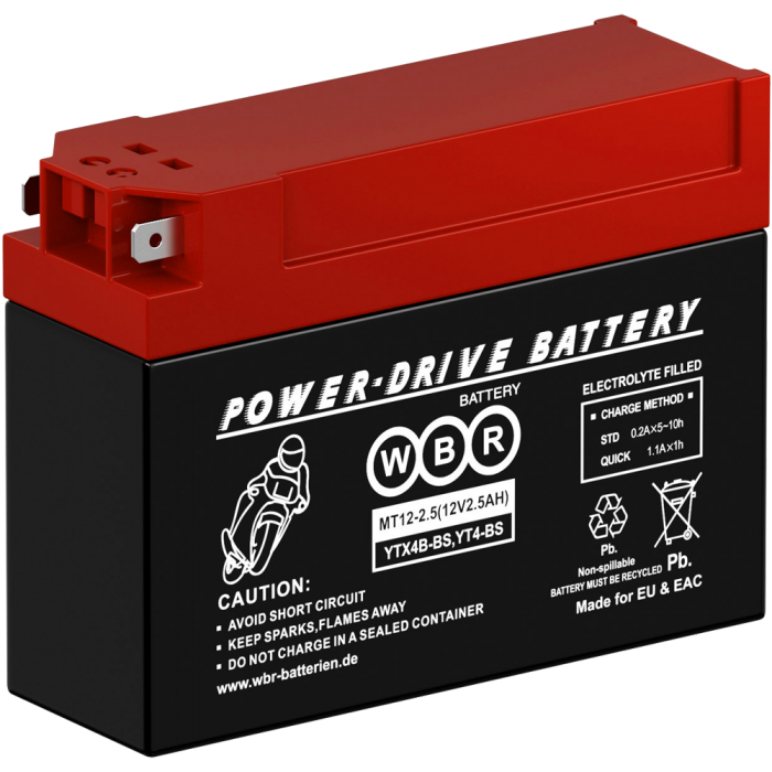 Аккумулятор WBR МТ12-2.5 - герметизированная, выполненная по технологии AGM, необслуживаемая (MF) стартерная мотоциклетная свинцово-кислотная аккумуляторная батарея. Обладает высоким качеством и надежностью. Она предназначена для запуска двигателя мотоциклов, скутеров, гидроциклов, квадроциклов, снегоходов и мотовездеходов. Батарея соответствует техническим характеристикам и является аналогом мотоциклетных аккумуляторных батарей YUASA модели YTX4B-BS.