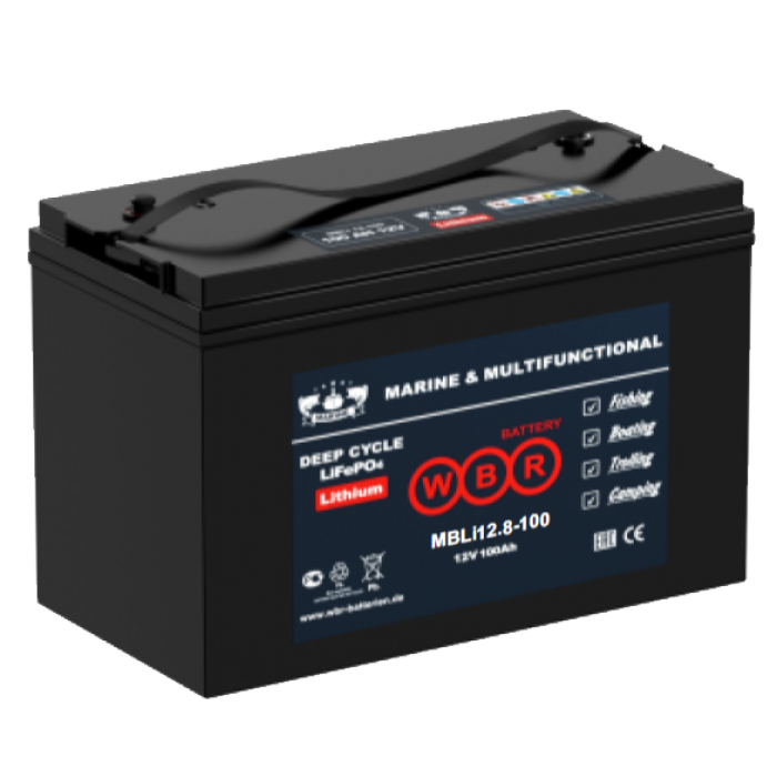 Аккумулятор WBR Marine серии MBLi12.8-100 - литиевая (литий железо фосфатные LiFePO4), герметизированная, лодочная аккумуляторная батарея. Обладает высоким качеством и надежностью, высокой цикличностью использования, устойчивы к глубоким разрядам и применяются для питания на яхтах, катерах и моторных лодках. Возможно применение как источников питания для электронасосов, эхолотов, осветительных приборов и другого вспомогательного оборудования. Обладают в 20 раз большей цикличностью и большим сроком службы, чем свинцово-кислотные аккумуляторы, что помогает минимизировать затраты на замену и снизить общую стоимость владения. Аккумулятор MBLi12.8-100 вдвое мощнее, имеет более высокую скорость разряда, сохраняя при этом высокую энергетическую емкость, на 60% легче аналогичной свинцово-кислотной батареи. Превосходная безопасность: химия фосфата лития железа исключает риск взрыва или горения из-за сильного удара, перезаряда или короткого замыкания.