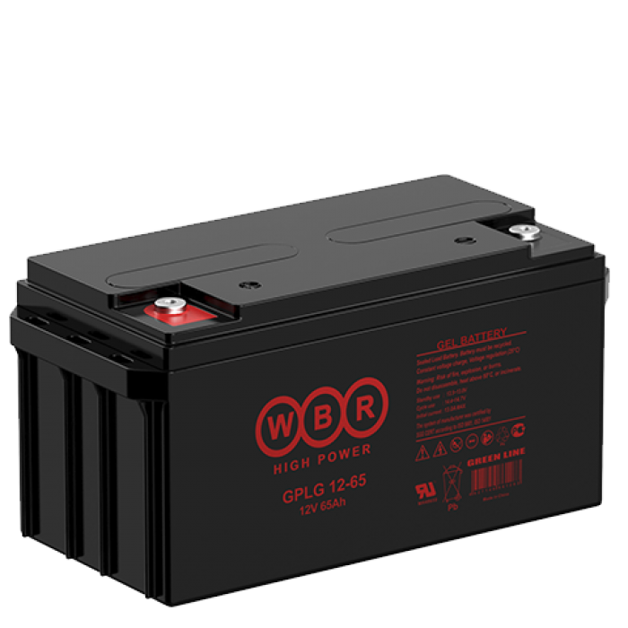 WBR GPLG12-65 - герметизированные, выполненные по гелевой (GEL) технологии, свинцово-кислотные аккумуляторные батареи общего применения со сроком службы 12 лет в буферном режиме или более 350 циклов заряда-разряда в циклическом режиме при 100% разряде. Эти высокоэффективные перезаряжаемые батареи не требуют обслуживания в течение всего срока службы. Основные области применения: источники бесперебойного питания (UPS), охранные и пожарные системы безопасности, оборудование телекоммуникации и электросвязи, аварийное освещение, телеметрическое, контрольное и другое оборудование.