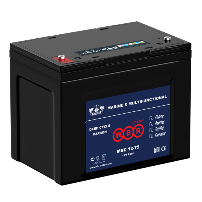 Аккумулятор WBR MBC12-75 - свинцово-кислотная карбоновая (Carbon) высоко цикличная выполненная по технологии AGM лодочная аккумуляторная батарея. Обладают высоким качеством и надежностью, высокой цикличностью использования, устойчива к глубоким разрядам и применяется для питания на яхтах, катерах и моторных лодках. Возможна к применению как источник питания для электронасосов, эхолотов, осветительных приборов и другого вспомогательного оборудования.