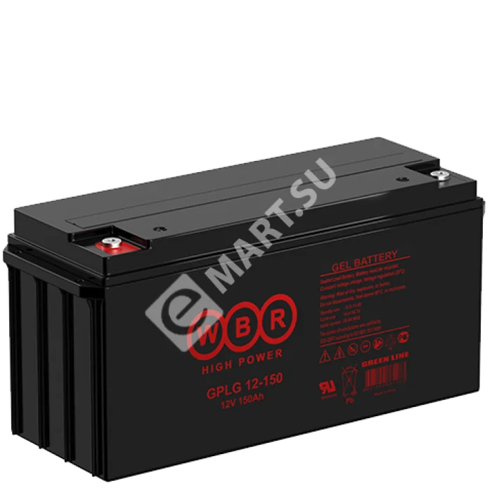 WBR GPLG12-150 - герметизированные, выполненные по гелевой (GEL) технологии, свинцово-кислотные аккумуляторные батареи общего применения со сроком службы 12 лет в буферном режиме или более 350 циклов заряда-разряда в циклическом режиме при 100% разряде. Эти высокоэффективные перезаряжаемые батареи не требуют обслуживания в течение всего срока службы. Основные области применения: источники бесперебойного питания (UPS), охранные и пожарные системы безопасности, оборудование телекоммуникации и электросвязи, аварийное освещение, телеметрическое, контрольное и другое оборудование.