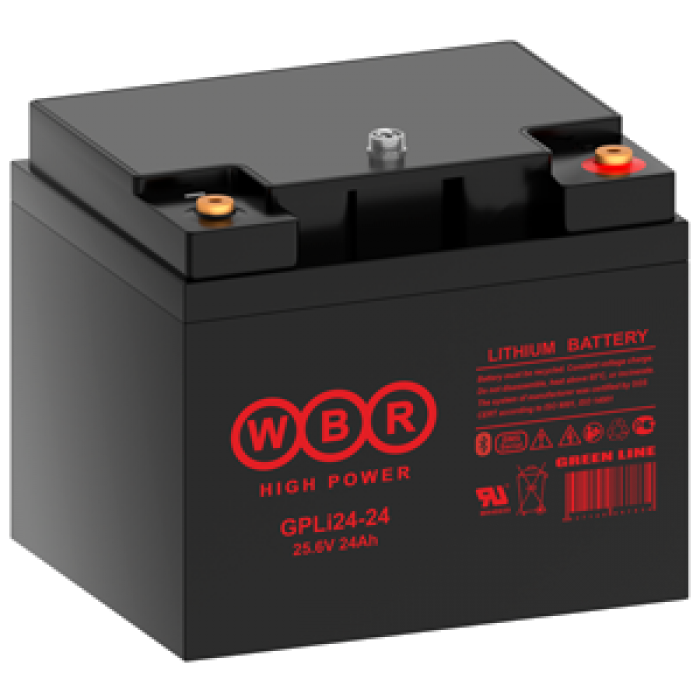 Аккумулятор WBR серии GPLi24-24 литий-железо-фосфатные (LiFePO4), обладающие высоким качеством и надежностью, увеличенной в 10 раз цикличностью использования и уменьшенным на 60% весом по сравнению со свинцово-кислотными аккумуляторными батареями. Современная технология производства аккумуляторов с использованием химического взаимодействия углерода и феррофосфата на основе литий-ионных аккумуляторов исключает риск воспламенения или взрыва при сильном ударе, перезаряде или коротком замыкании.