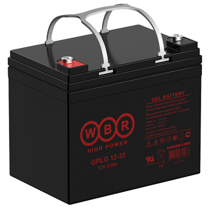 WBR GPLG12-33 - герметизированные, выполненные по гелевой (GEL) технологии, свинцово-кислотные аккумуляторные батареи общего применения со сроком службы 12 лет в буферном режиме или более 350 циклов заряда-разряда в циклическом режиме при 100% разряде. Эти высокоэффективные перезаряжаемые батареи не требуют обслуживания в течение всего срока службы. Основные области применения: источники бесперебойного питания (UPS), охранные и пожарные системы безопасности, оборудование телекоммуникации и электросвязи, аварийное освещение, телеметрическое, контрольное и другое оборудование.
