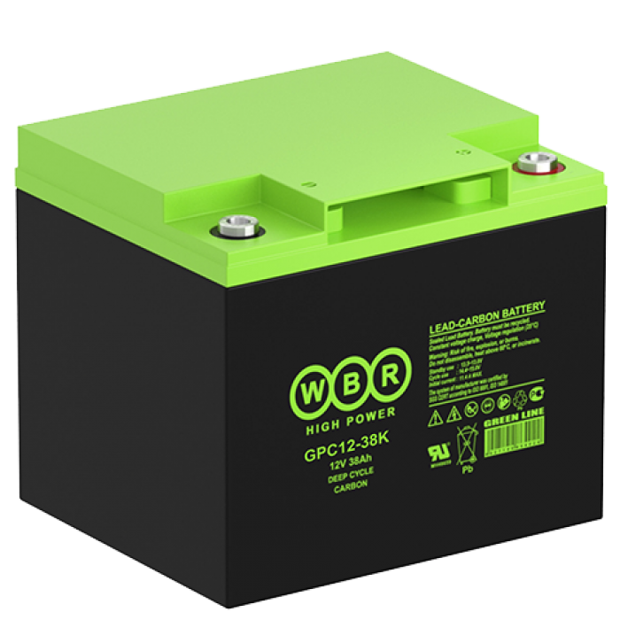 Аккумулятор WBR GPC12-38K - герметизированная, карбоновая, свинцово кислотная, аккумуляторная батарея со сроком службы 15 лет или более 1900 расчетных циклов заряда-разряда в циклическом режиме при 70% разряде. Эта высокоэффективная, перезаряжаемая батарея не требует обслуживания в течение всего срока службы и за счет использования чистого свинца, а также добавки углерода в состав электродов получили улучшенные зарядные и разрядные характеристики.