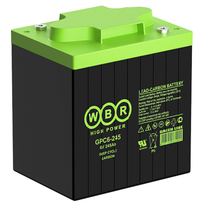 Аккумулятор WBR GPC6-245 - герметизированная, карбоновая, свинцово кислотная, аккумуляторная батарея со сроком службы 15 лет или более 1900 расчетных циклов заряда-разряда в циклическом режиме при 70% разряде. Эта высокоэффективная, перезаряжаемая батарея не требует обслуживания в течение всего срока службы и за счет использования чистого свинца, а также добавки углерода в состав электродов получили улучшенные зарядные и разрядные характеристики.