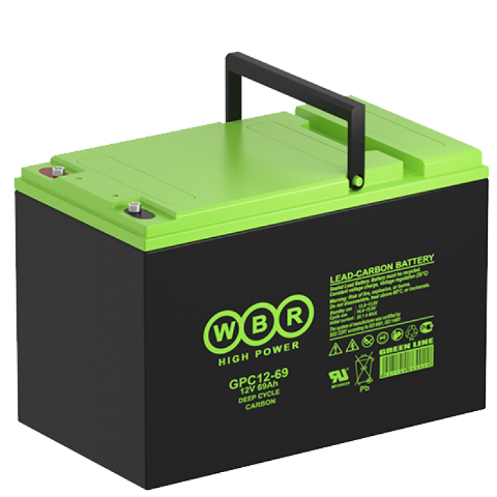 Аккумулятор WBR GPC12-69 - герметизированная, карбоновая, свинцово кислотная, аккумуляторная батарея со сроком службы 15 лет или более 1900 расчетных циклов заряда-разряда в циклическом режиме при 70% разряде. Эта высокоэффективная, перезаряжаемая батарея не требует обслуживания в течение всего срока службы и за счет использования чистого свинца, а также добавки углерода в состав электродов получили улучшенные зарядные и разрядные характеристики.