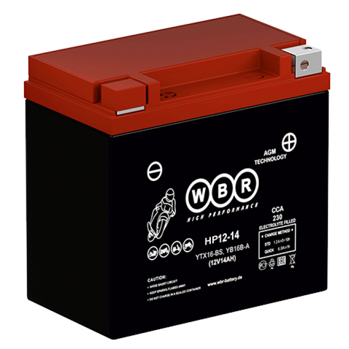 Аккумулятор WBR HP12-14 - герметизированная, выполненная по технологии AGM, стартерная мотоциклетная свинцово-кислотная батарея. Обладает высоким качеством и надежностью. Эта аккумуляторная батарея успешно выдерживает конкуренцию со стартерными батареями этого класса других производителей, соответствует техническим характеристикам и является аналогом мотоциклетных аккумуляторных батарей YUASA Y50-N18L-A, Y50-N18L-A3, YTX24HL-BS. Она предназначена для эксплуатации на мотоциклах, скутерах, гидроциклах, квадроциклах, снегоходах и мотовездеходах.