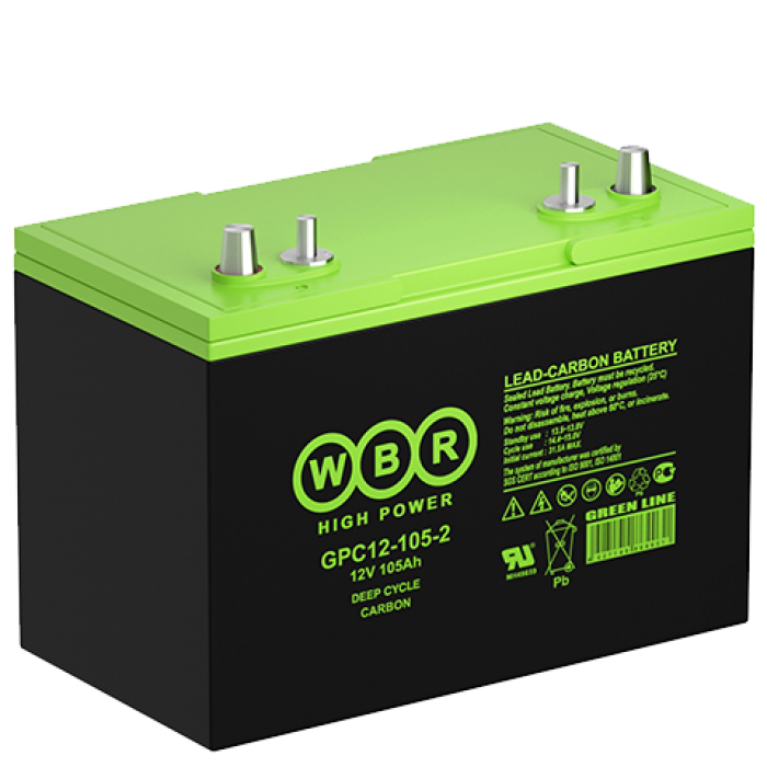 Аккумулятор WBR GPC12-105-2 - герметизированная, карбоновая, свинцово кислотная, аккумуляторная батарея со сроком службы 15 лет или более 1900 расчетных циклов заряда-разряда в циклическом режиме при 70% разряде. Эта высокоэффективная, перезаряжаемая батарея не требует обслуживания в течение всего срока службы и за счет использования чистого свинца, а также добавки углерода в состав электродов получили улучшенные зарядные и разрядные характеристики.