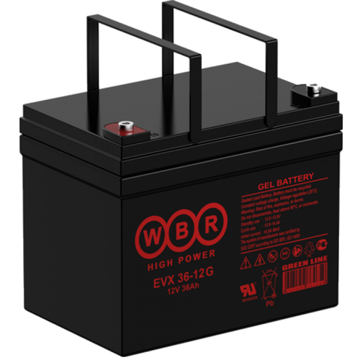Аккумулятор WBR EVX36-12G - герметизированная, выполненная по гелевой (GEL) технологии, тяговая свинцово-кислотная аккумуляторная батарея. Обладает высоким качеством и надежностью, устойчива к глубоким разрядам и применяется для питания электрических транспортных средств, гольфкаров, газонокосилок, полотерных и поломоечных машин, медицинских колясок, электроинструмента, электронасосов, эхолотов, осветительных приборов, в том числе наружного освещения и другой техники.