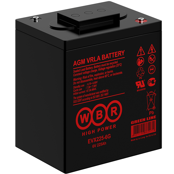 Аккумулятор WBR EVX225-6G - герметизированная, выполненная по гелевой (GEL) технологии, тяговая свинцово-кислотная аккумуляторная батарея. Обладают высоким качеством и надежностью, устойчивы к глубоким разрядам и применяются для питания электрических транспортных средств, гольфкаров, газонокосилок, полотерных и поломоечных машин, электронасосов, осветительных приборов, в том числе и наружного освещения, и другого вспомогательного оборудования.
