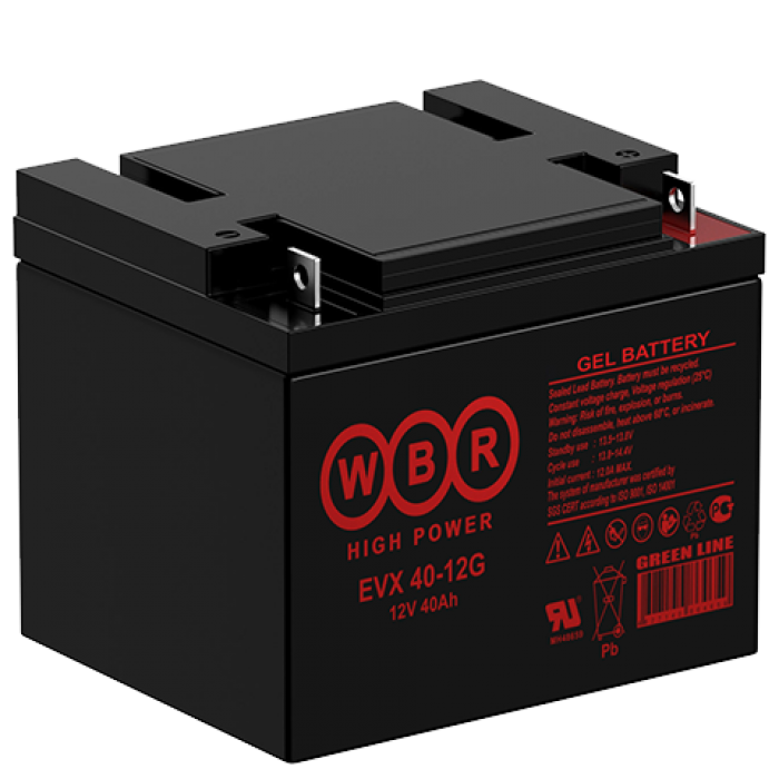 Аккумулятор WBR EVX40-12G - герметизированная, выполненная по гелевой (GEL) технологии, тяговая свинцово-кислотная аккумуляторная батарея. Обладает высоким качеством и надежностью, устойчива к глубоким разрядам и применяется для питания электрических транспортных средств, гольфкаров, газонокосилок, полотерных и поломоечных машин, медицинских колясок, электроинструмента, электронасосов, эхолотов, осветительных приборов, в том числе наружного освещения и другой техники.