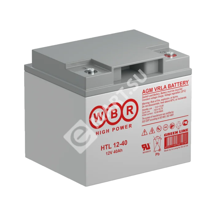 Аккумуляторы WBR серии HTL12-40 - герметизированные, выполненные по технологии AGM, свинцово-кислотные аккумуляторные батареи общего применения с увеличенным до 15 лет сроком службы в буферном режиме при 20 °С. Эти высокоэффективные перезаряжаемые батареи не требуют обслуживания в течение всего срока службы. Основные области применения: источники бесперебойного питания (UPS), оборудование систем телекоммуникации и электроэнергетики, аварийное освещение, освещение пешеходных переходов и светофоры на солнечных батареях, системы «умного дома» для жарких регионов, в которых оборудование работает при высоких температурах.