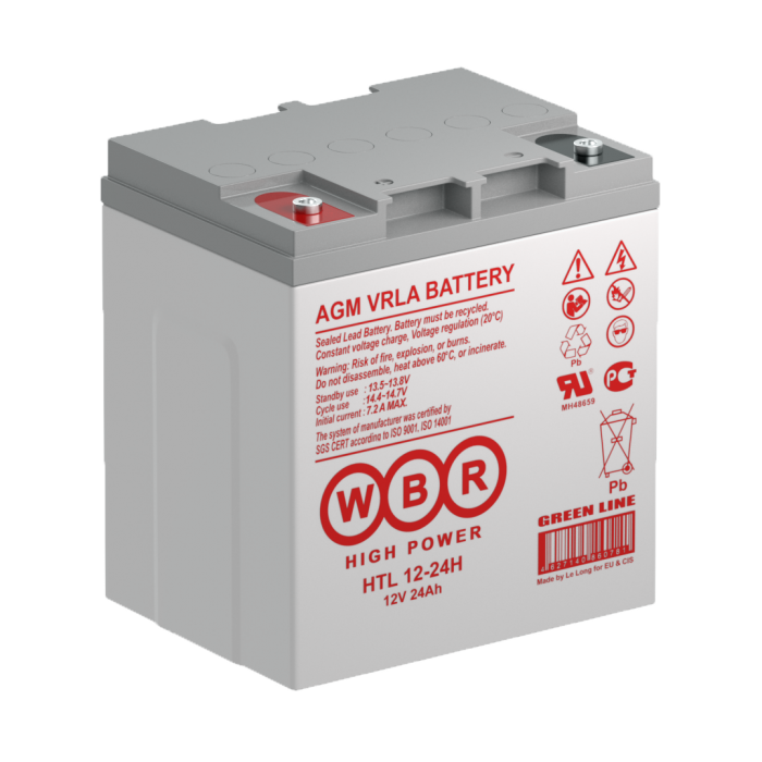 Аккумуляторы WBR серии HTL12-24H - герметизированные, выполненные по технологии AGM, свинцово-кислотные аккумуляторные батареи общего применения с увеличенным до 15 лет сроком службы в буферном режиме при 20 °С. Эти высокоэффективные перезаряжаемые батареи не требуют обслуживания в течение всего срока службы. Основные области применения: источники бесперебойного питания (UPS), оборудование систем телекоммуникации и электроэнергетики, аварийное освещение, освещение пешеходных переходов и светофоры на солнечных батареях, системы «умного дома» для жарких регионов, в которых оборудование работает при высоких температурах.