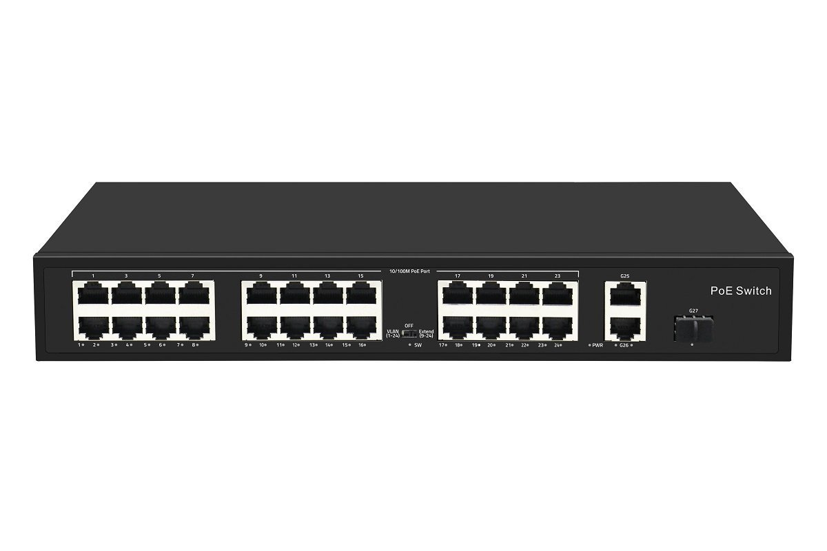 Неуправляемый коммутатор PoE NIKOMAX, 24*10/100 Мбит/с PoE (802.3af/at), 9-24 порт до 250 метров cat6, 2*1 Гбит/с Base-T, 1*1 Гбит/с SFP, VLAN, 300Вт