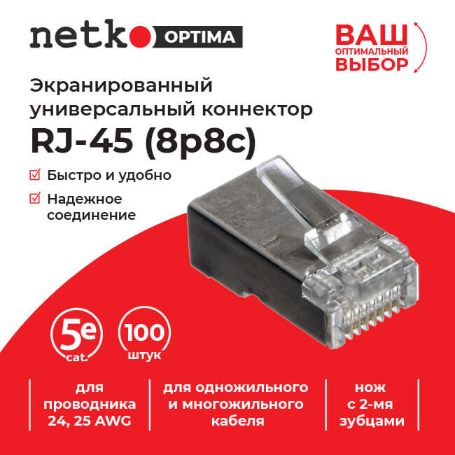 Коннектор RJ45 (8p8c) cat.5е, экранированный, для одножильного и многожильного кабеля (нож с 2-мя зубцами), 100шт, NETKO Optima