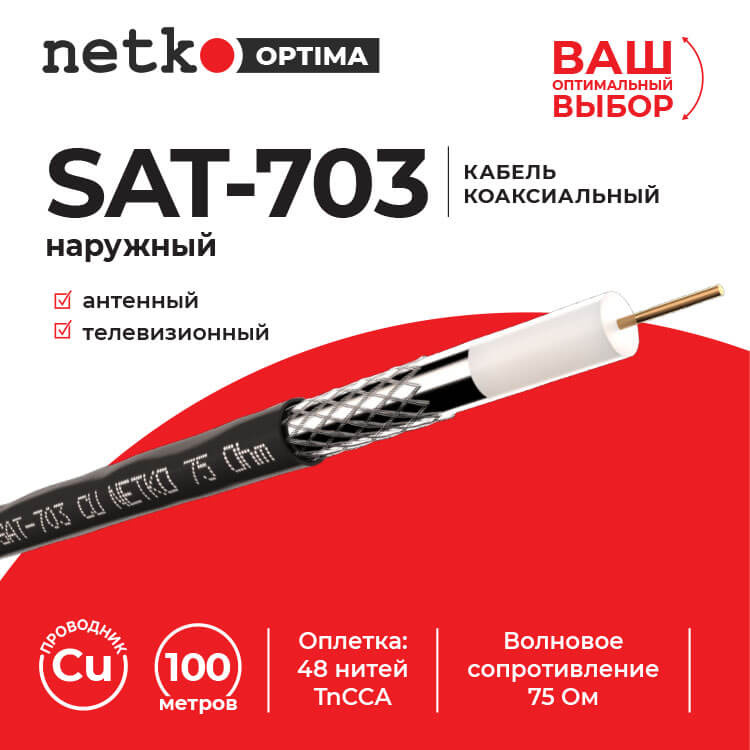 Кабель коаксиальный SAT-703, 75 Ом (CU, оплетка 48 нитей TnCCA), черный, наружный (100м) NETKO Optima