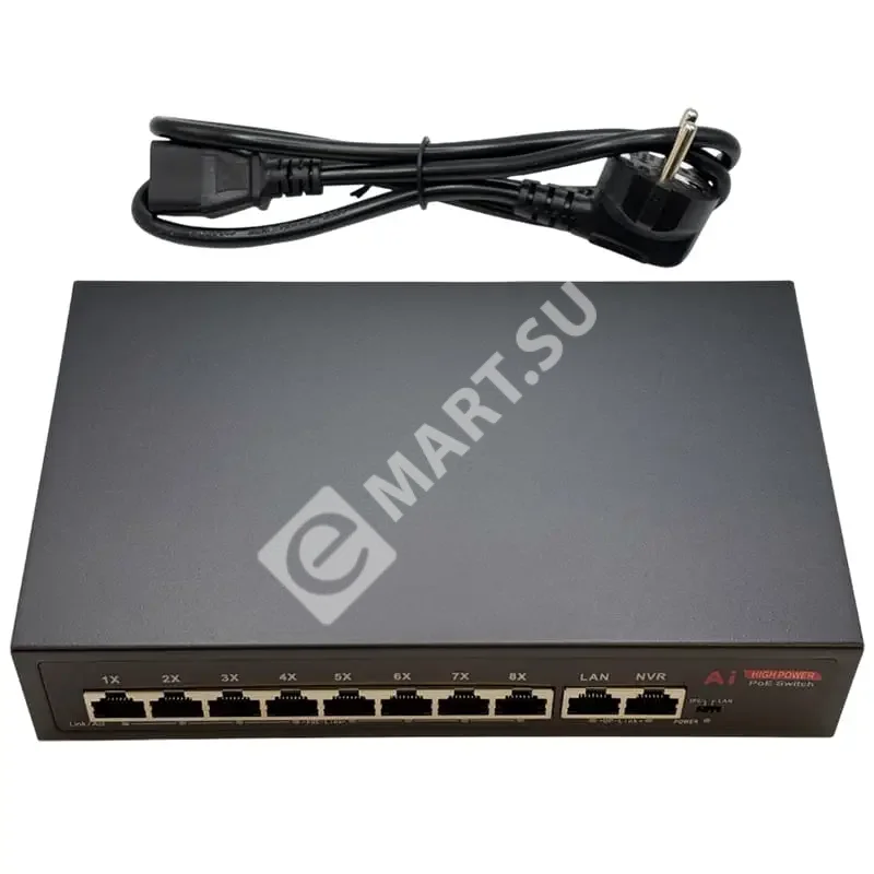 - Поддержка стандартов PoE: IEEE 802.3af (PoE, 15.4 Вт) и IEEE 802.3at (PoE+, 30 Вт) гарантируют совместимость с широким спектром IP-камер и других PoE-устройств.